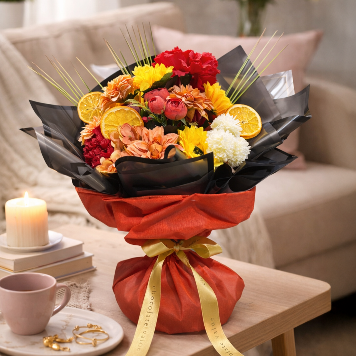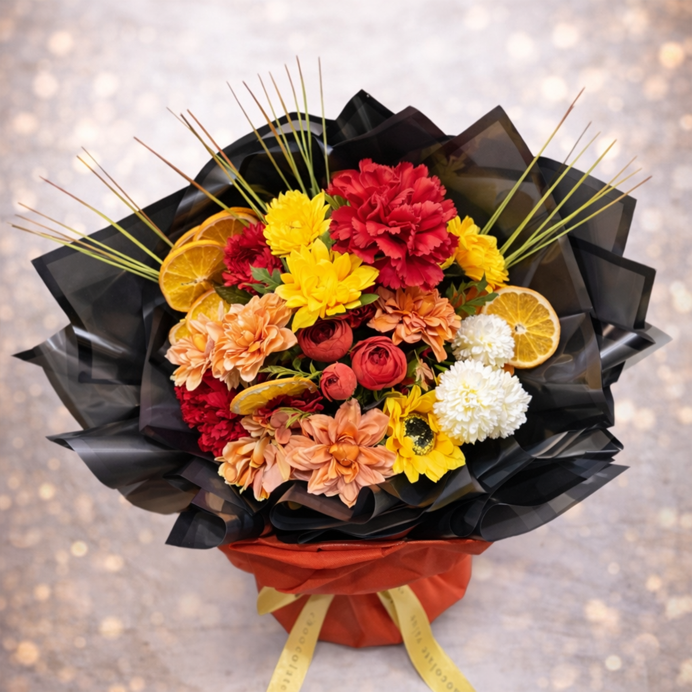 Bu özel aranjman, gerçeğine son derece yakın görünüme sahip premium kalite dekoratif çiçekler kullanılarak hazırlanmıştır. Solmaz, bakım gerektirmez ve uzun süre formunu korur.