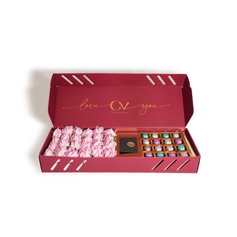 Sevdiklerinize zarif bir dokunuş katın, bordo kutuda pembe güller ve yaldızlı çikolatalarla aşkınızı anlatın!