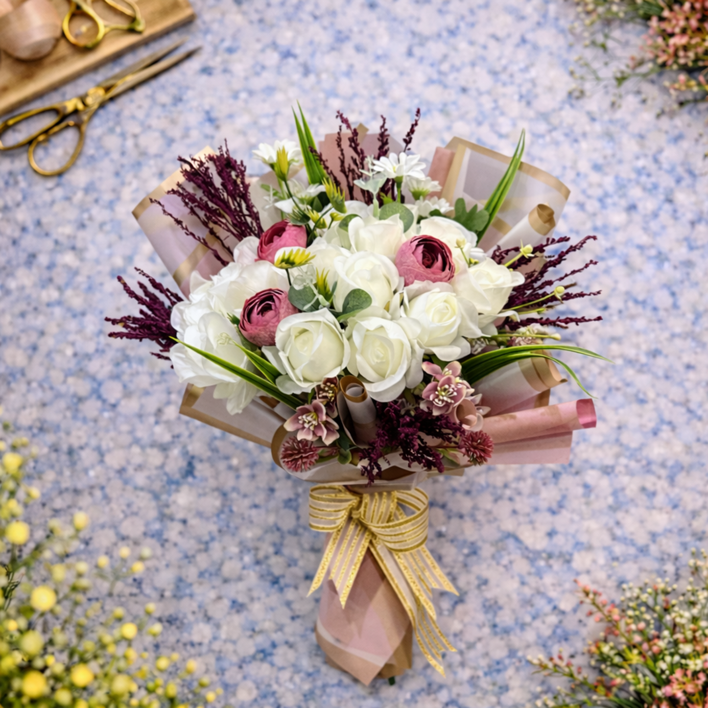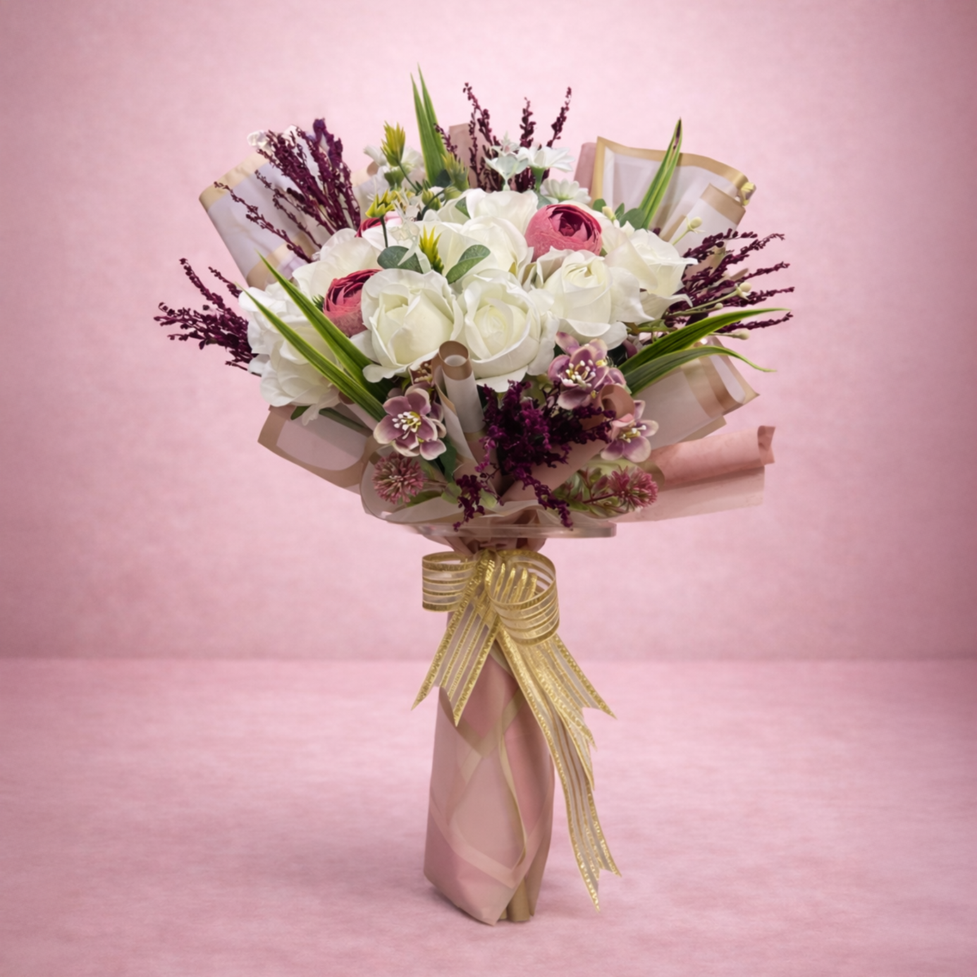 Zarafeti, sadeliği ve romantik dokunuşları bir araya getiren Beyaz Gül & Pudra Ranunkulus Premium Buketi, özel anlarda duygularını şık bir şekilde ifade etmek isteyenler için tasarlanmıştır.