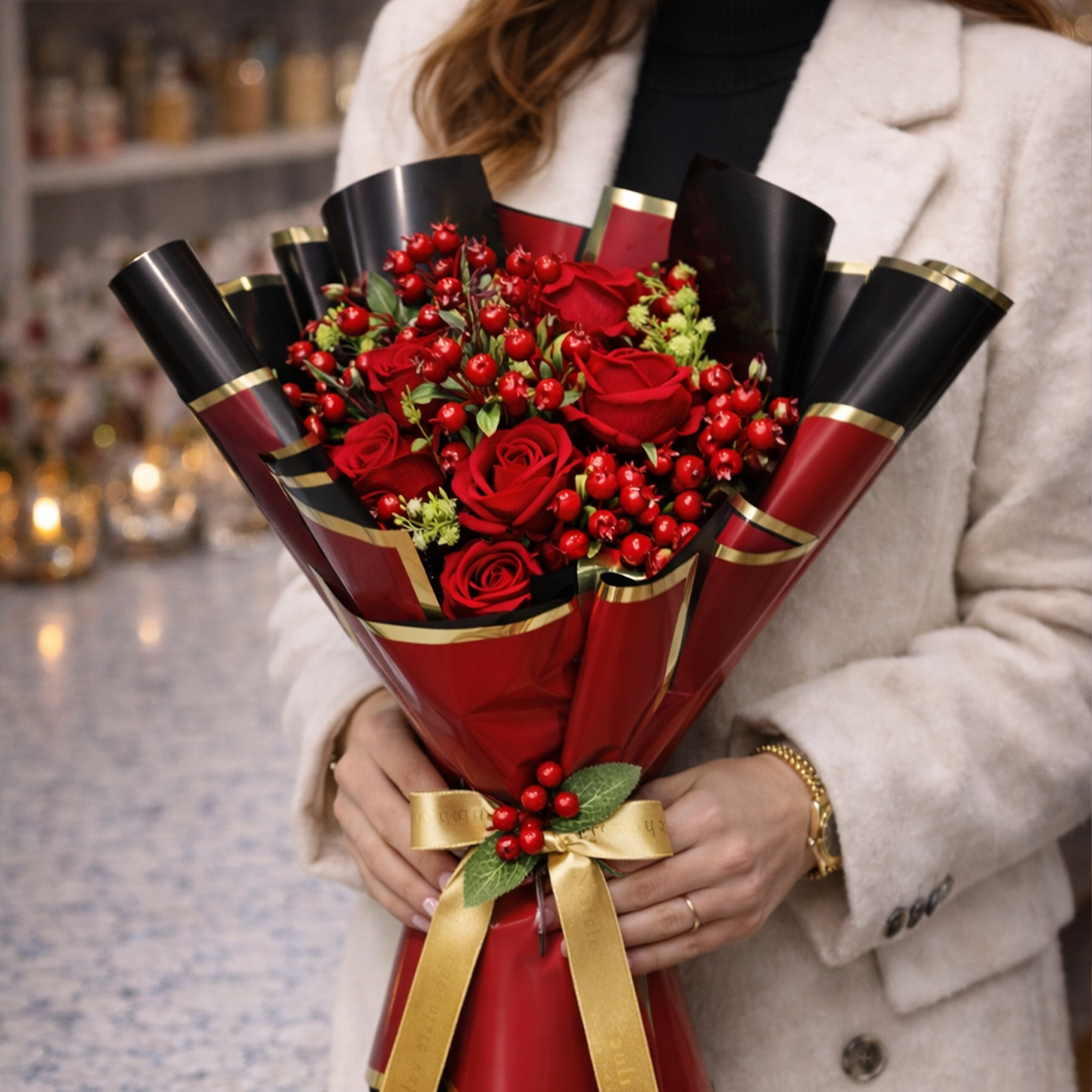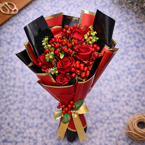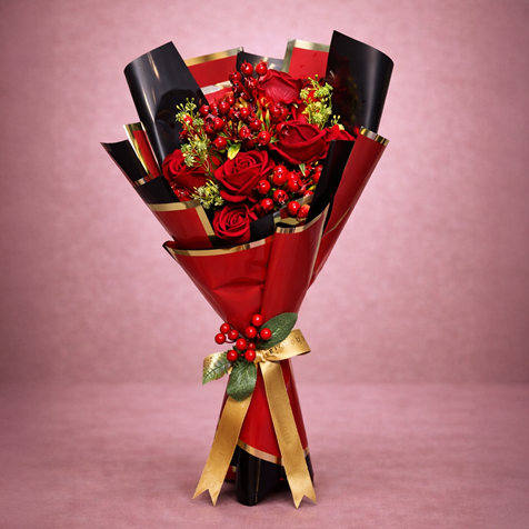 Gerçeğine son derece yakın görünüme sahip premium kalite solmayan yapay kırmızı güller ve dekoratif kırmızı meyve detayları kullanılarak hazırlanmıştır. Solmaz, bakım gerektirmez ve uzun süre ilk günkü formunu korur.