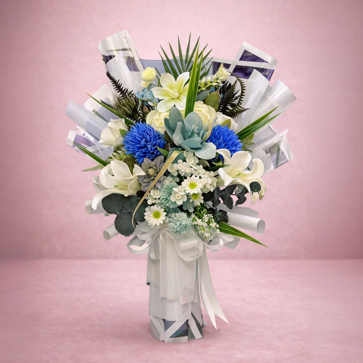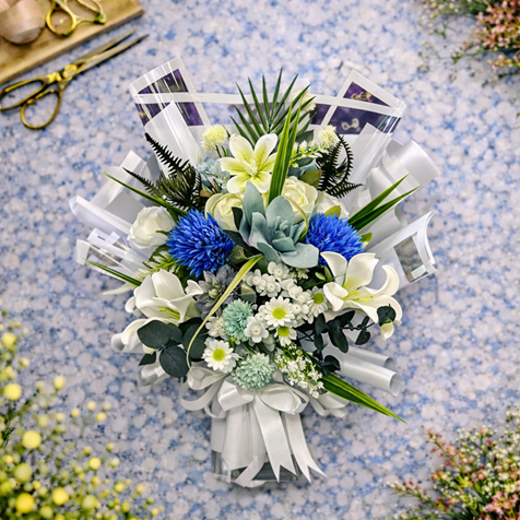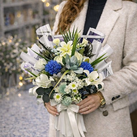 Beyazın saflığını, mavinin huzur veren tonlarıyla birleştiren Mavi Ferahlık Premium Çiçek Buketi, modern, zarif ve iç açıcı bir hediye alternatifi sunar.