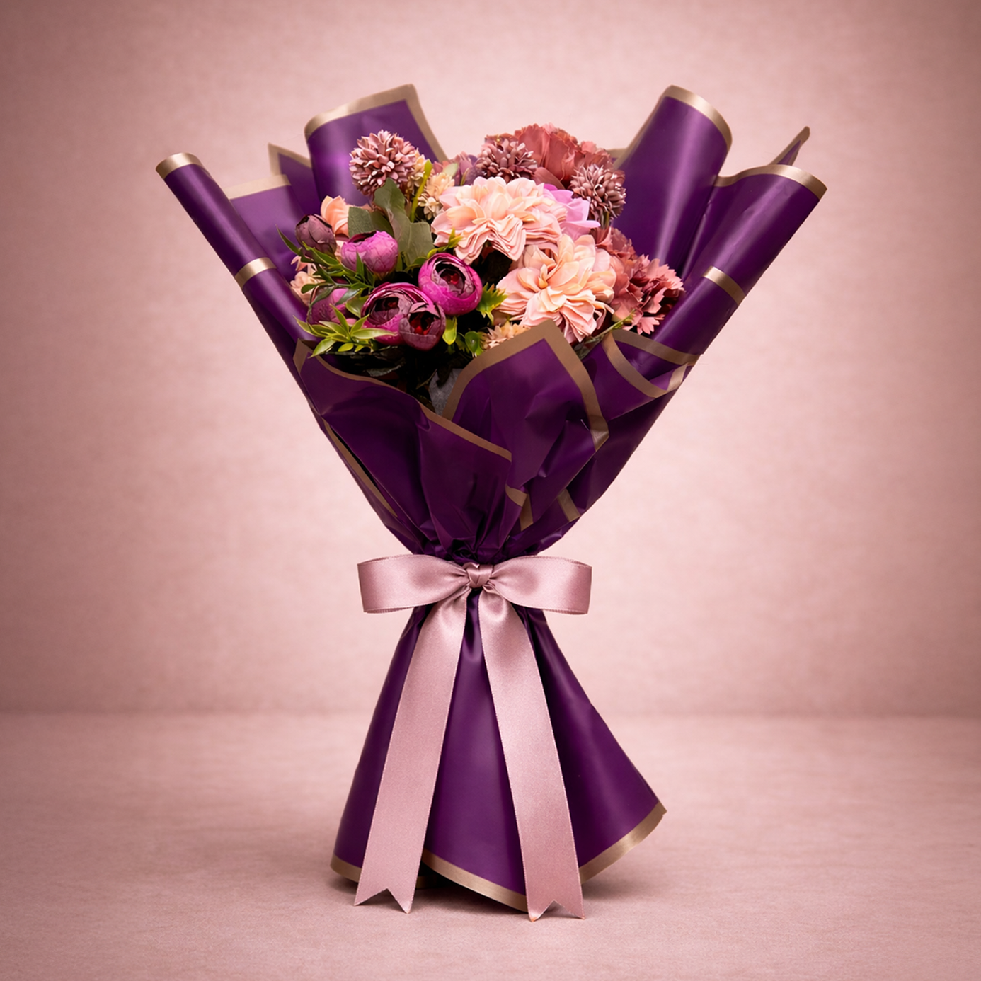 Mor ve pudra tonlarının zarafetini bir araya getiren Erzurum Mor Asalet Çiçek Buketi, şık tasarımı ve kalıcı yapısıyla uzun süre hatırlanacak bir hediye sunar.