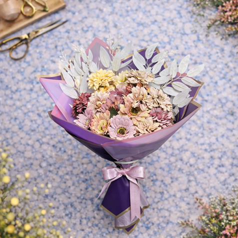 Mor ve lila tonlarındaki özel ambalajı, beyaz yaprak detayları ve yumuşak pastel çiçekleriyle öne çıkan Lavanta Zarafeti Premium Çiçek Buketi, sakin, zarif ve romantik bir hediye arayanlar için tasarlanmıştır.