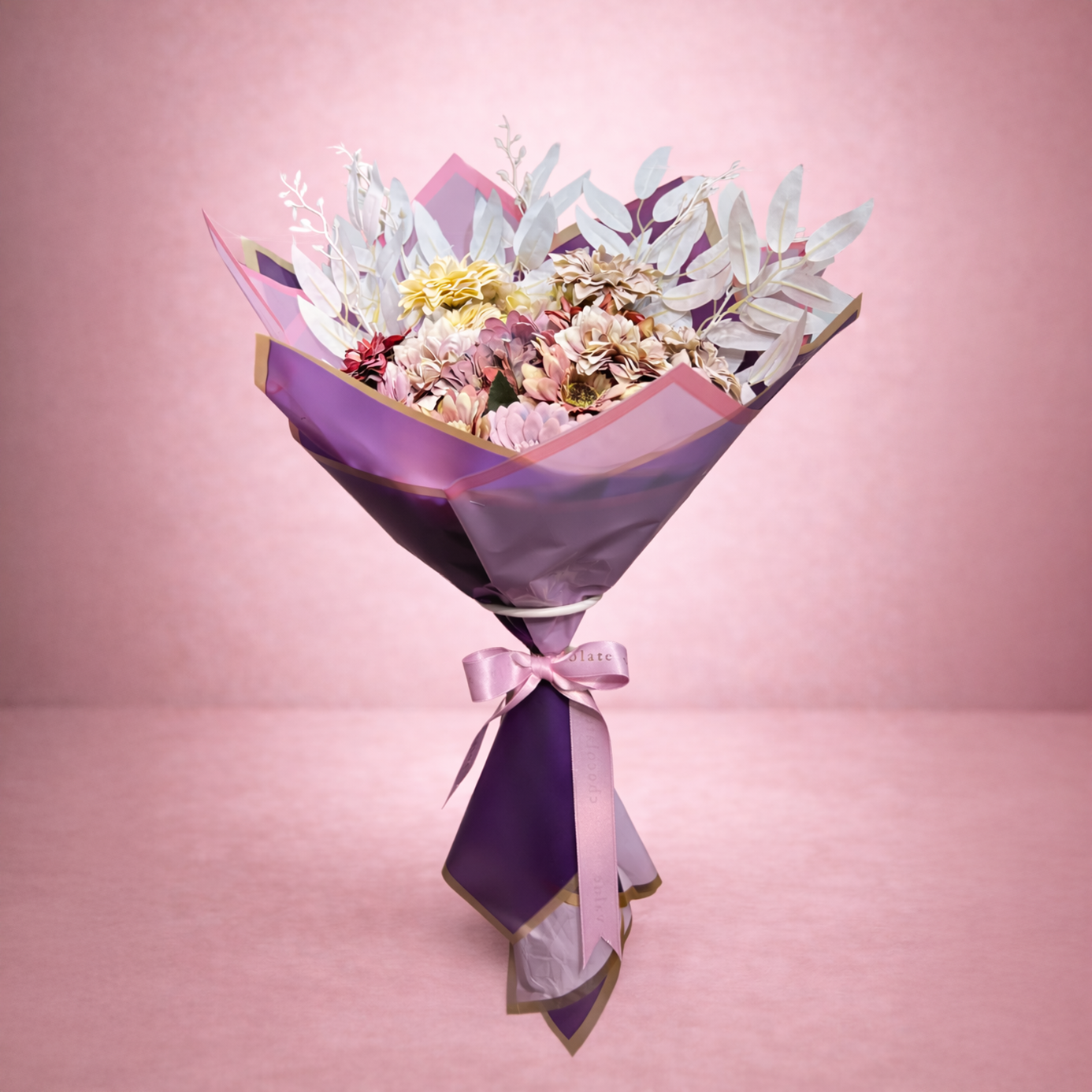 Mor-lila katmanlı ambalaj ve açık pembe saten kurdele detayı sayesinde buket hem romantik hem de lüks bir görünüm sunar.