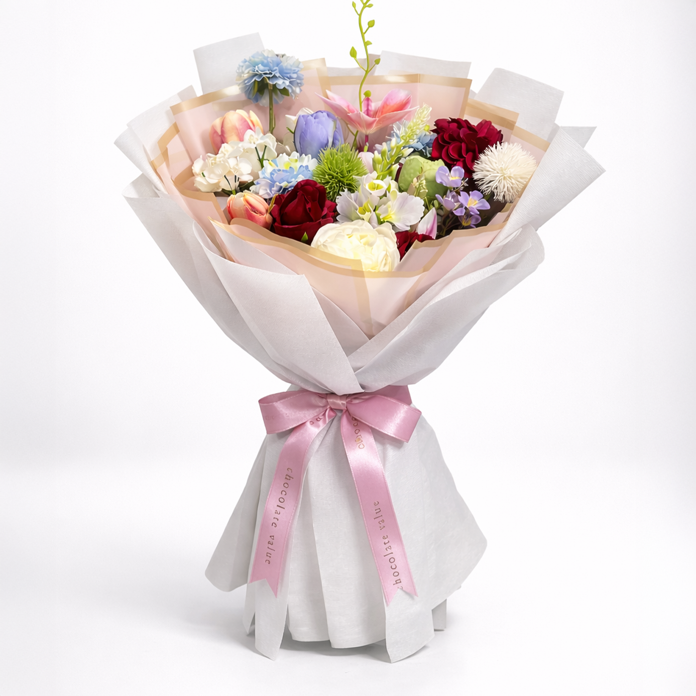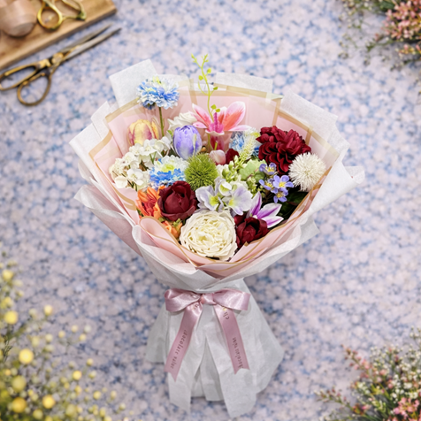 Bu özel buket, renk uyumu ve çiçek çeşitliliği açısından oldukça zengindir. İçeriğinde yer alan çiçekler şunlardır: