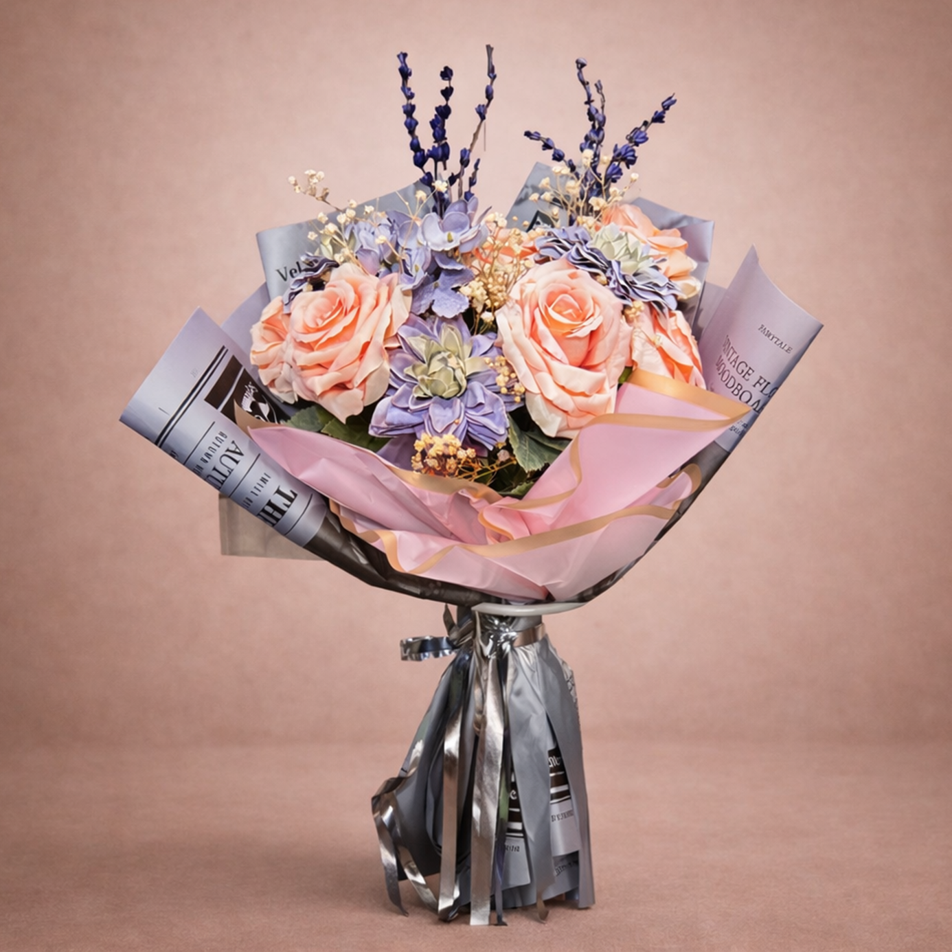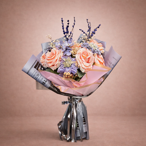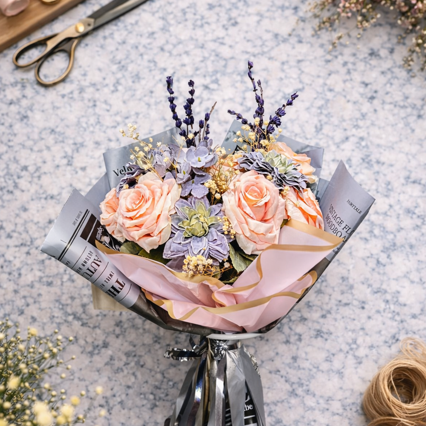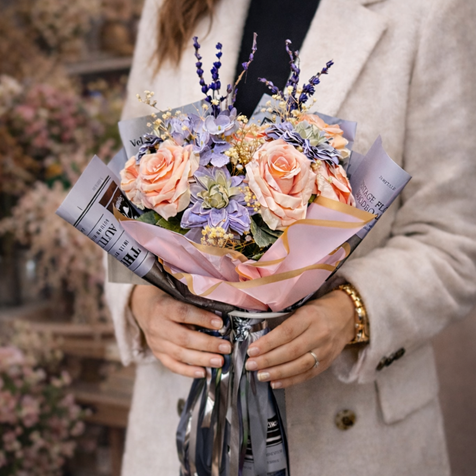 Pastel tonların huzur veren uyumuyla hazırlanan bu özel çiçek buketi; soft pembe güller, lavanta tonlarında çiçekler ve zarif tamamlayıcı detaylar ile tasarlanmıştır. Sade, şık ve romantik bir hediye arayanlar için ideal bir seçenektir.