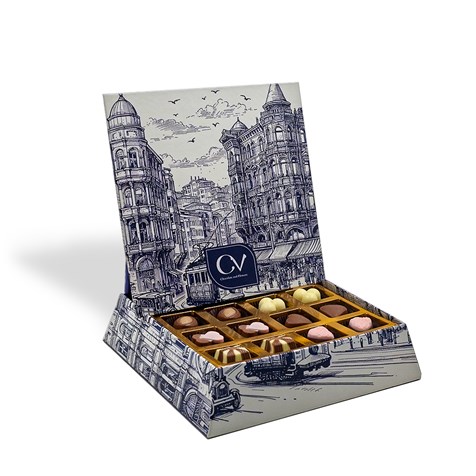 Eski İstanbul’un zarafetini ve tarihi dokusunu yansıtan bu özel çikolata kutusu, 16 adet sütlü çikolata ile dolu. Meyve, kahve, karamel, fındık ve fıstık gibi zengin tatlar bir araya gelerek her bir çikolatada eşsiz bir lezzet deneyimi sunuyor. Zarif tasarımı, kutuya uyumlu özel çantası ve kişiye özel mesaj kartı ile şıklığı ve anlamı birleştiriyor.