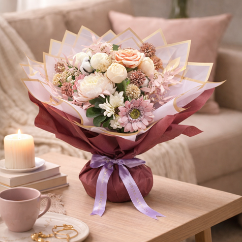 Yumuşak pudra, krem ve pastel tonların bordo ambalajla kusursuz uyumunu yansıtan Pudra Zarafeti Saksı Aranjmanı, bulunduğu her ortama sofistike bir şıklık katar.