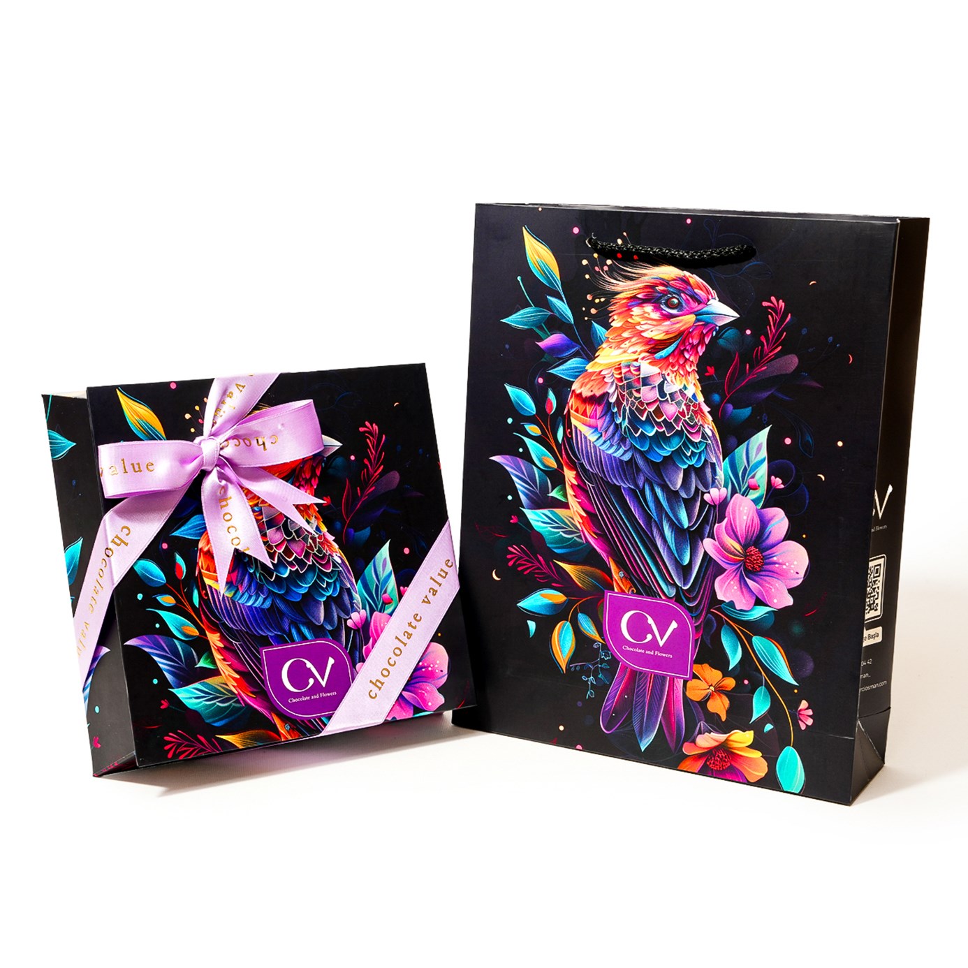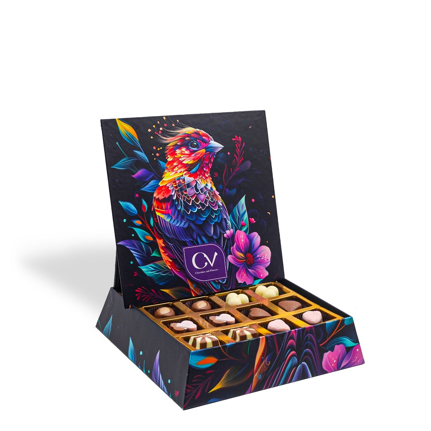 Doğanın renkli paletinden ilham alarak tasarlanan bu özel kutu, lezzet ve zarafetin eşsiz buluşmasını sunuyor. Kuş temalı, parıltılı detaylarıyla bu kutu, hediye dünyasına sanat dolu bir dokunuş getiriyor.