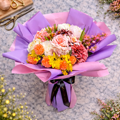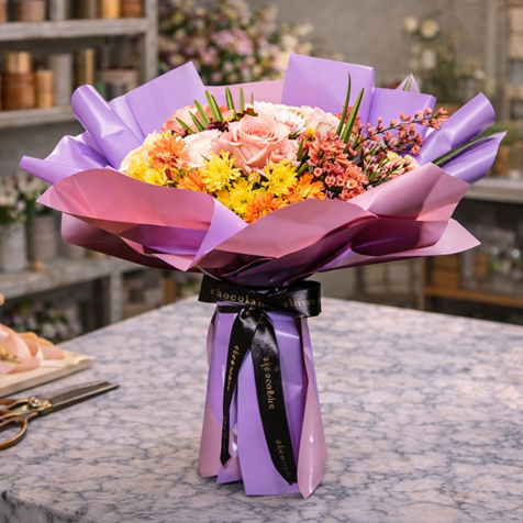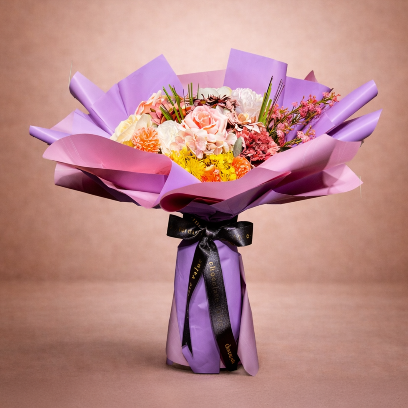 Canlı tonlardaki karışık çiçeklerin uyumla bir araya getirildiği bu premium aranjman, enerjik ve zarif bir hediye sunar. Özel renkli ambalajı ve marka kurdelesiyle modern bir görünüm kazanır.
